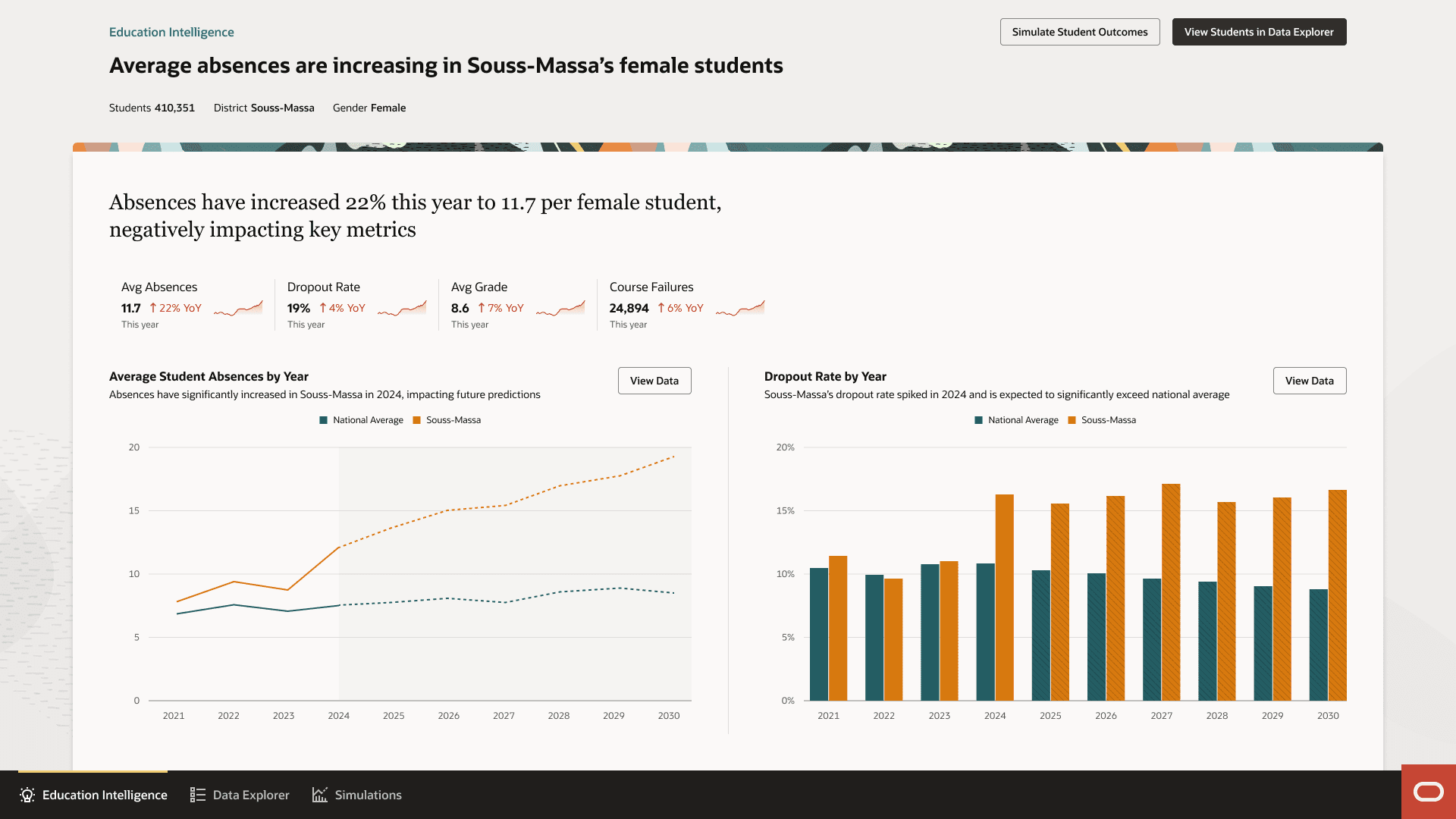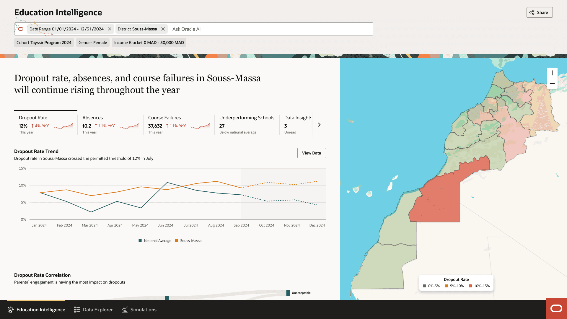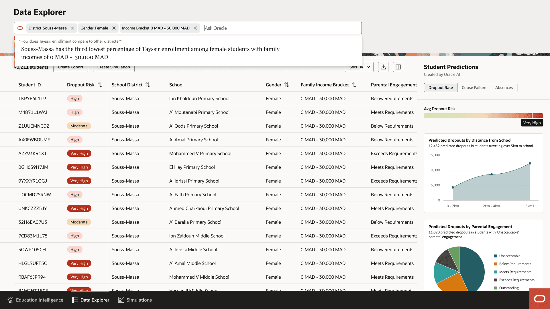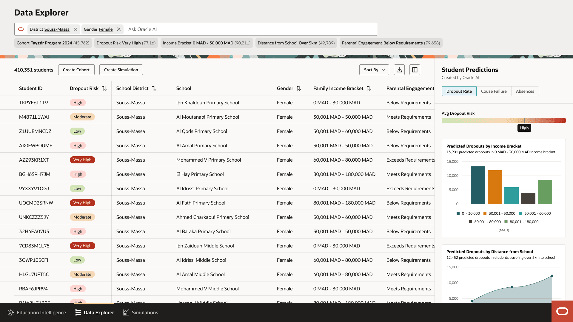 The Data Explorer provides open-ended analysis for building cohorts and exploring patterns. Officials can filter and segment students by any combination of factors (region, school, gender, income, attendance, etc.) to create targeted groups for intervention.
