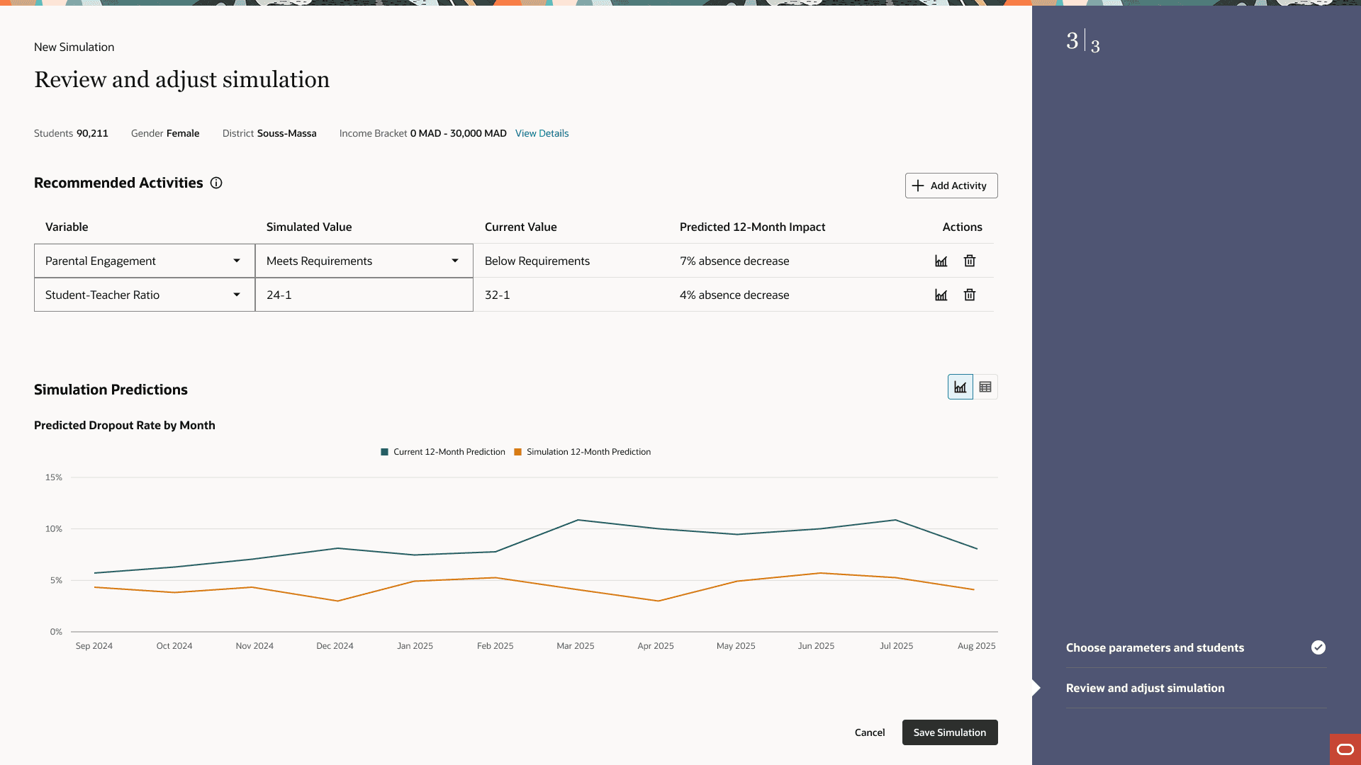 The system lets users experiment with different intervention strategies( adjusting program scope, duration, targeting criteria, etc.) and see predicted impact on student outcomes. Officials can compare multiple simulation scenarios side-by-side to identify the most effective use of limited resources.