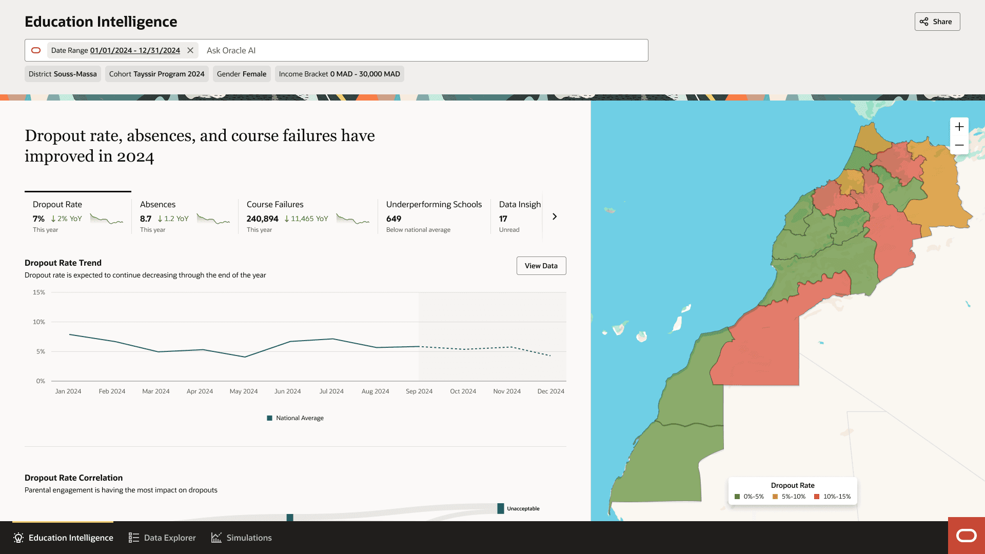 AI predictions identify dropout risk, expected absences, course failures, and underperforming schools at multiple levels. Officials can view regional performance patterns on map-based visualizations, drill down to school-level insights, then examine individual student predictions.