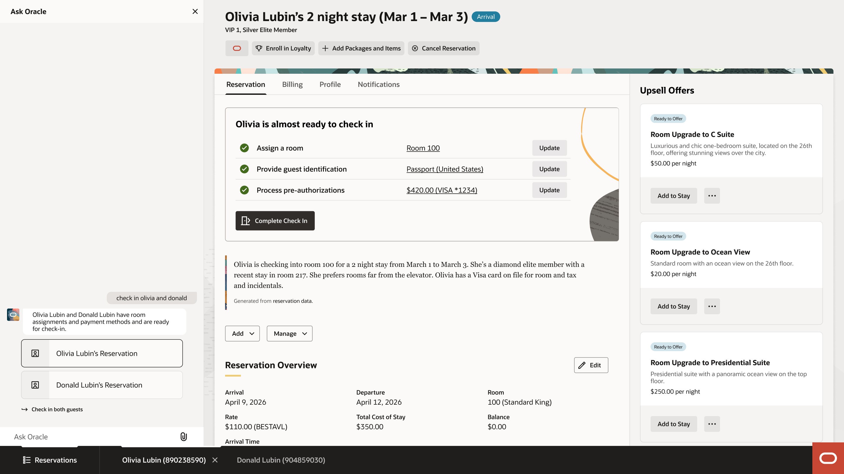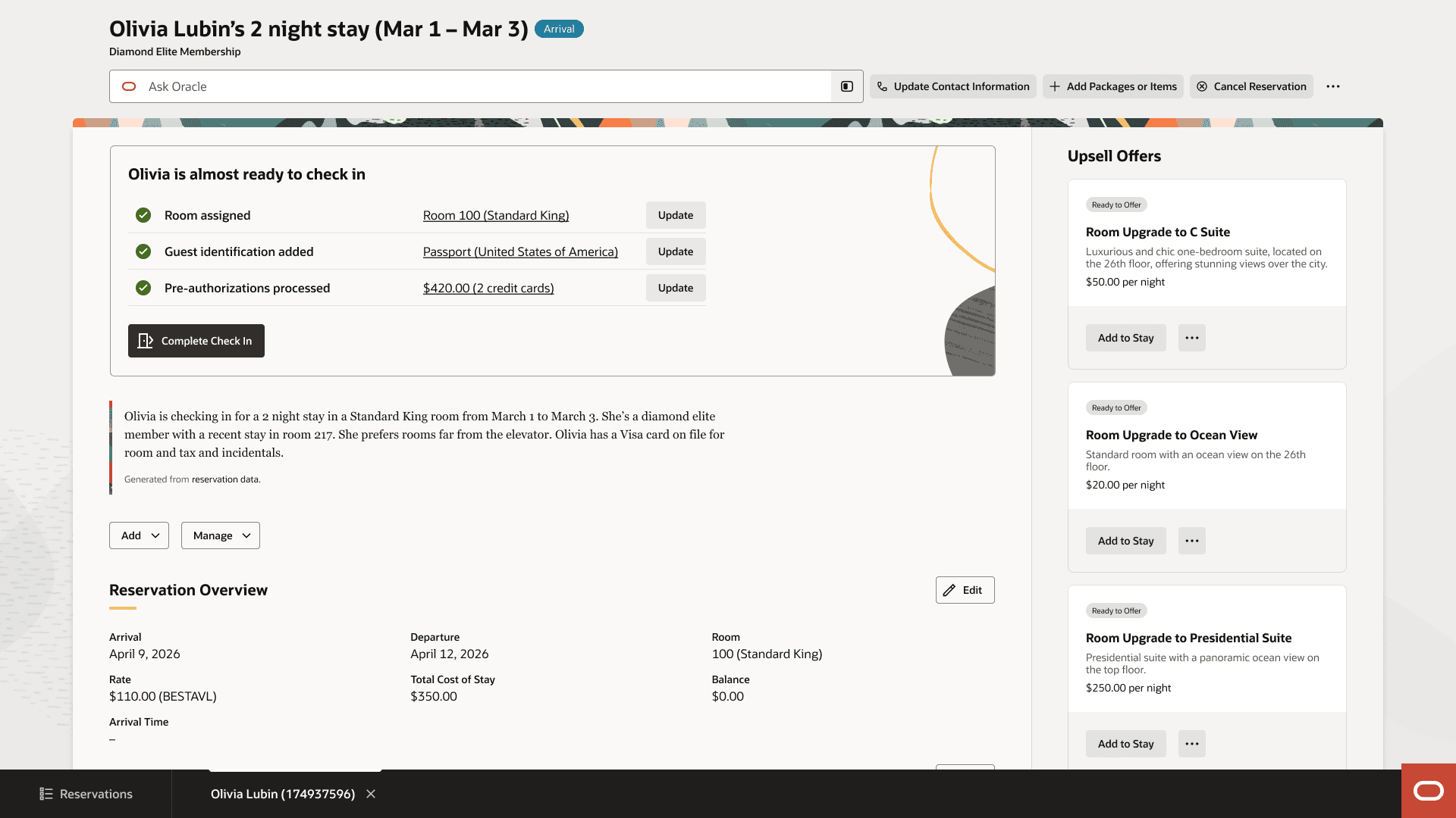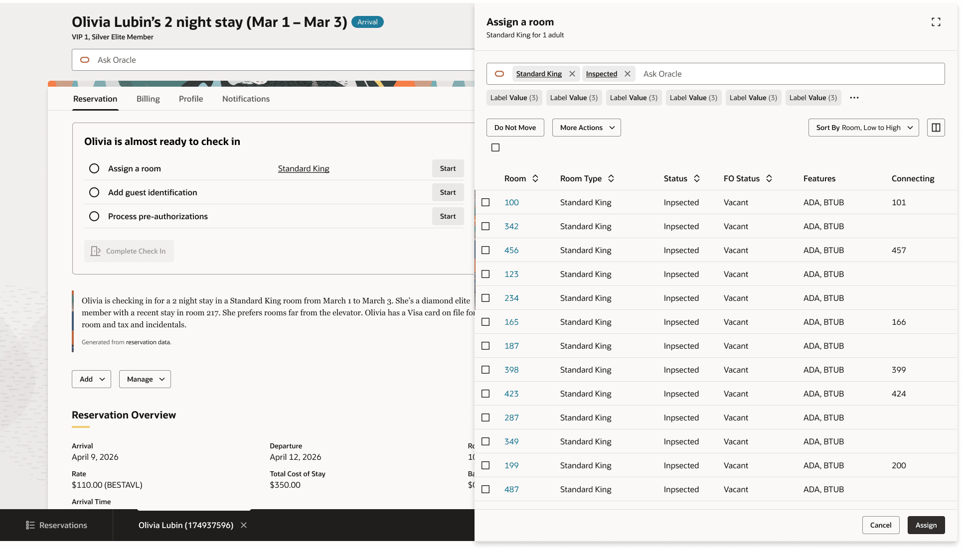 AI became central to this strategy. Hotel property management systems must support hundreds of possible tasks, from standard check-ins to rare exceptions like group billing splits or international tax calculations. The current product opted to expose every possible interaction on the screen at once. Ask Oracle, our AI assistant, offered an alternative path: radically simplify the core interface for common tasks, then use natural language as the gateway to everything else. Staff ask for what they need, and AI generates the appropriate interface or provides guidance.
