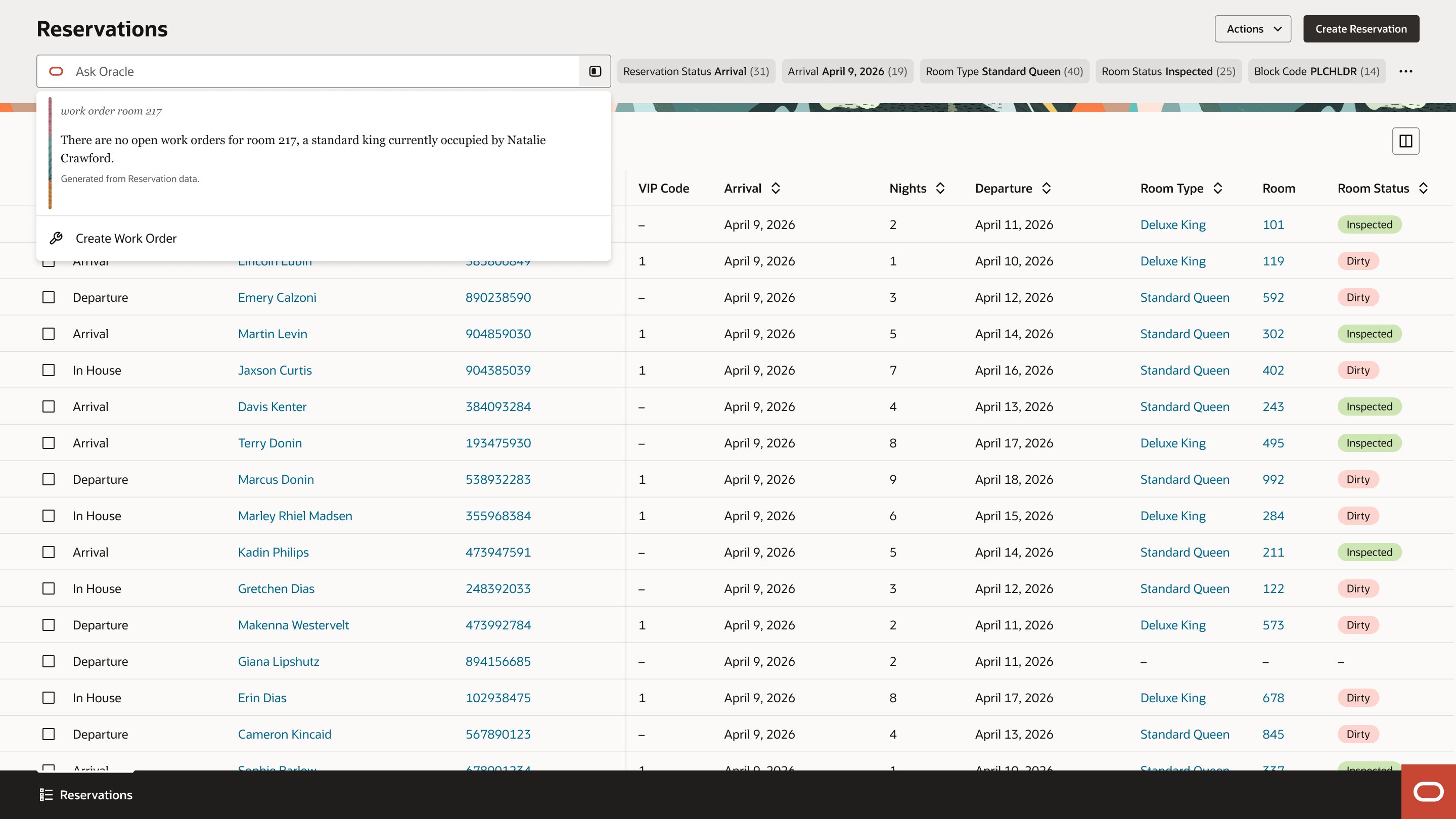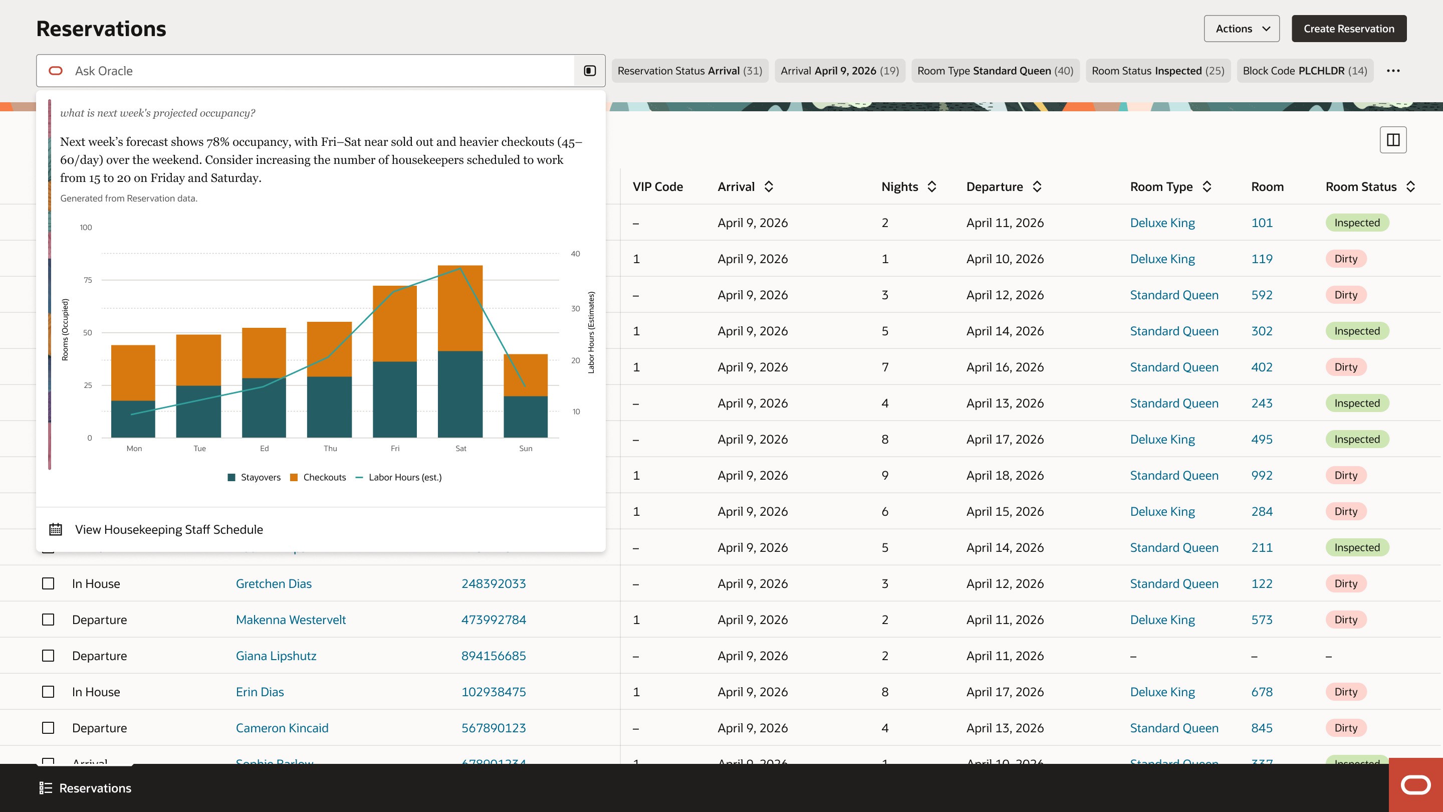 I introduced Ask Oracle, an AI-powered assistant accessible through natural language queries. Staff can ask questions (find reservation for John Smith), execute tasks (create work order for room 205), or get contextual help without navigating menus.