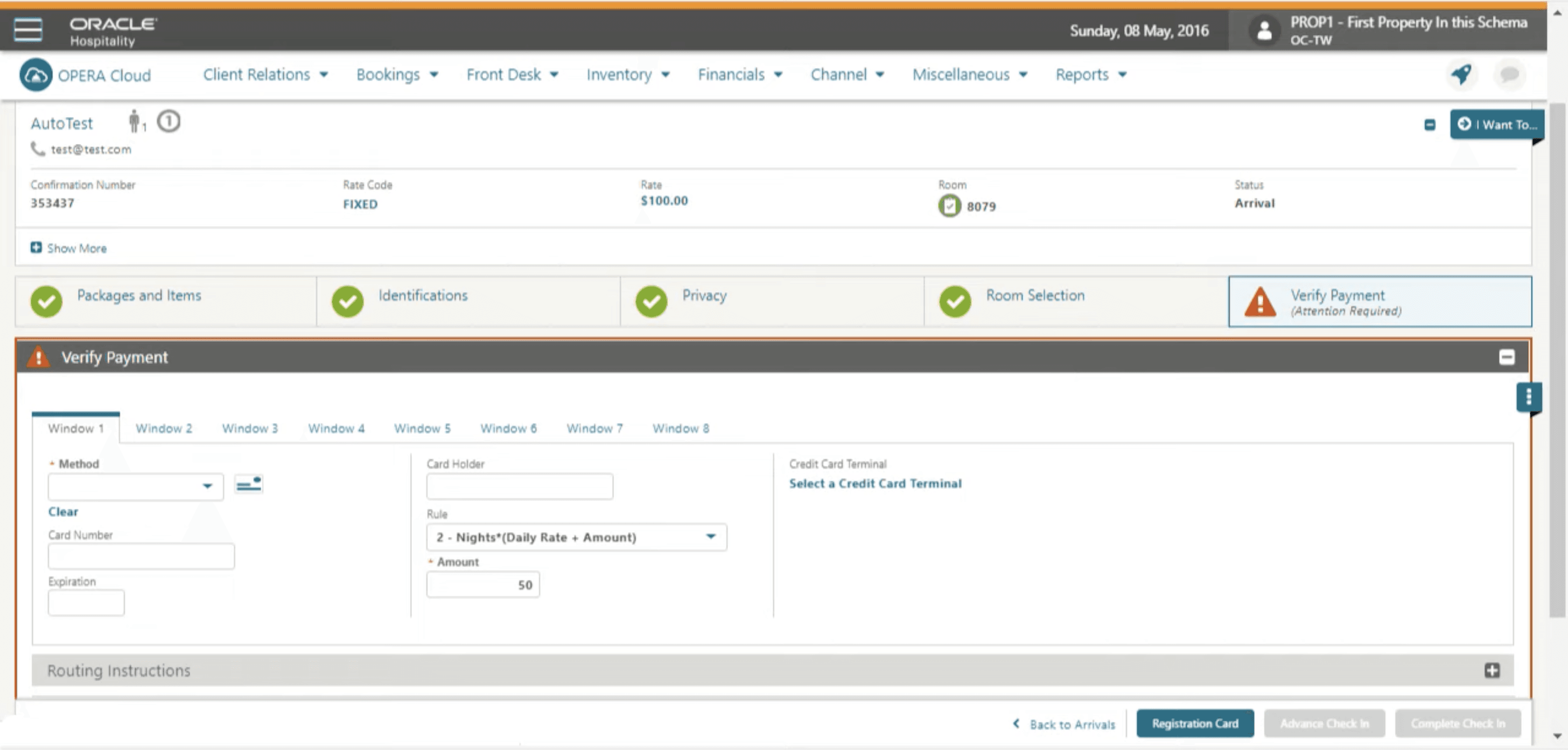 The new check-in widget provides step-by-step workflow with flexible ordering. Staff simply collect payment methods for room/tax and incidentals, and the system automatically routes charges correctly behind the scenes—no manual configuration required.